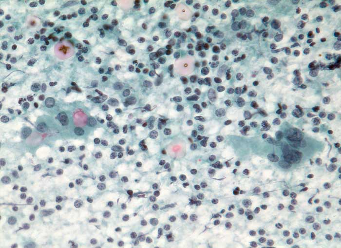 Frischgewebsabstrich Schilddrüse: Zahlreiche Lymphozyten. Onkozytäre Epithelien mit breitem Zytoplasma bilden Mikrofollikel, die wenig rotes Kolloid enthalten. Mehrkernige Riesenzelle.