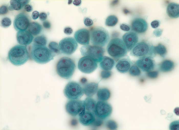Pleuraerguss: Die atypischen Zellen bilden insgesamt eine auffällig monomorphe Zellpopulation, so dass eine sichere Unterscheidung zwischen Karzinomzellen und hochgradig reaktiv veränderten Mesothelien nicht möglich ist. Auffallend sind die roten Makronukleolen.