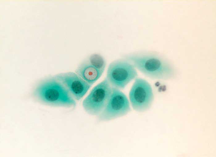 Zervixabstrich: paranukleäre scharfrandige Vakuole mit rotem Einschlusskörperchen.