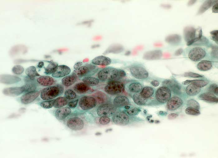 Portioabstrich: Dichte Aggregate unausgereifter Epithelien mit mässig polymorphen, grob strukturierten Kernen. Schmaler zyanophiler Zytoplasmaleib.