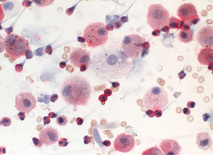 Bronchoalveoläre Lavage: Zahlreiche Lymphozyten reagieren mit dem T-Zell Marker CD4. Das Zytoplasma der Alveolarmakrophagen zeigt eine schwache unspezifische Anfärbung.