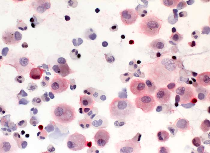 Bronchoalveoläre Lavage: nur wenige Lymphozyten sind positiv für den T-Zell Marker CD4. Die Alveolarmakrophagen zeigen eine schwache unspezifische Anfärbung des Zytoplasmas.