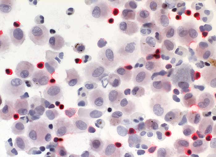 Der immunzytochemisch bestimmte HS-Quotient ist mit 0,35 klar erniedrigt. Dieser Befund lässt an eine exogen-allergische Alveolitis (Hypersensitivitätspneumonie) denken.