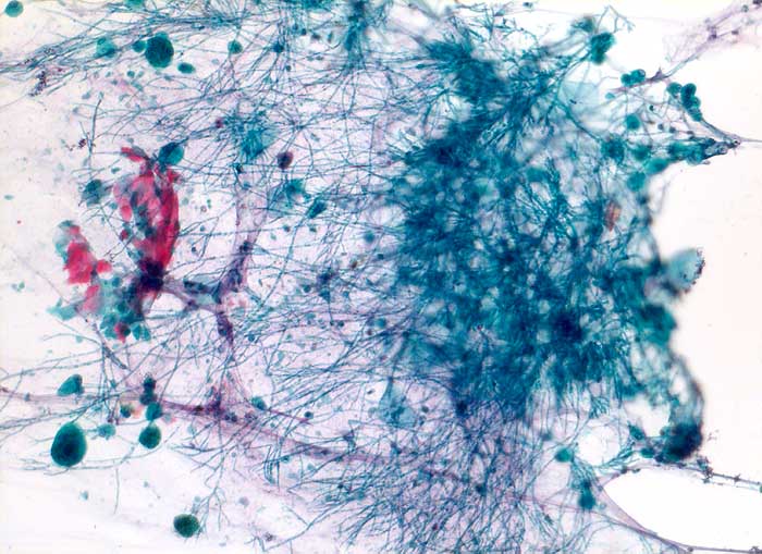 Broncho-alveoläre Lavage: Dichtes Knäuel von Pilzhyphen. Im Hintergrund Makrophagen und ein plattenepithelialer Zellverband.