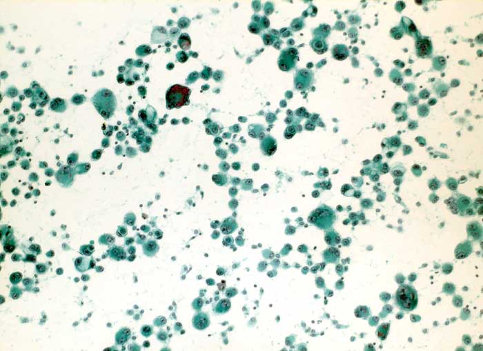 Pleuraerguss: massenhaft Zellen eines Adenokarzinoms. Die extreme Polymorphie mit sehr unterschiedlich grossen Tumorzellen passt zu einem primären Lungenkarzinom.