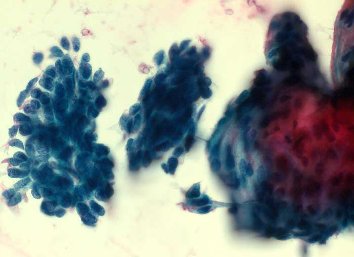 Portio/Zervix: atypische Epithelien. Die Kerne sind klein, mässiggradig polymorph, enthalten granuläres Chromatin aber keine vergrösserten Nukleolen. Ein Zytoplasmasaum ist nicht zu erkennen. Verhornungszeichen fehlen. Ausserdem erkennt man wenig Detritus und rote Blutkörperchen.