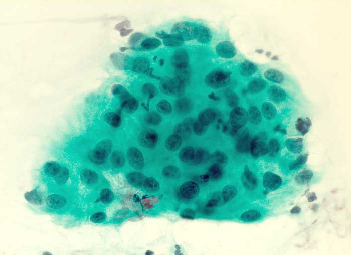 Portioabstrich: metaplastisches Epithel mit Ausdifferenzierung bis zum Parabasalzelltyp. Kerne mässig vergrössert und hyperchromatisch.