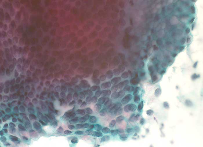 Portioabstrich: Normale endozervikale Zylinderzellen von seitlich aufgenommen mit intrazytoplasmatischer Schleimbildung und basalständigen hellen rundlichen Kernen. Von oben betrachtet sind die Zylinderzellen in regelmässigen Abständen angeordnet und die Zellgrenzen bilden ein Honigwabenmuster.