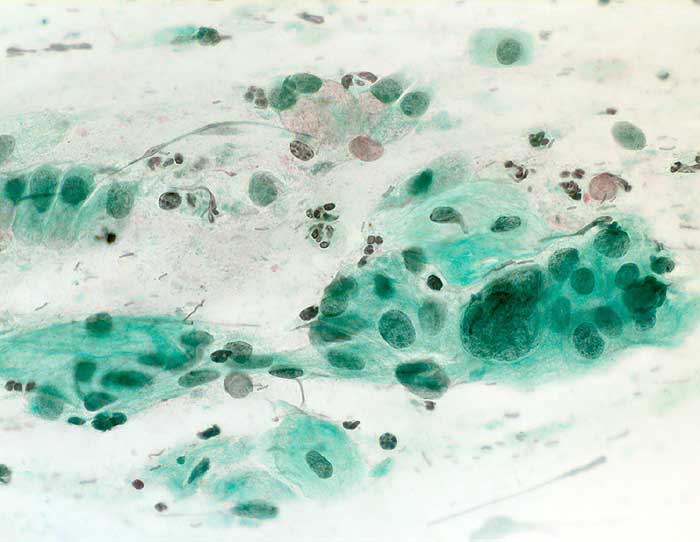 Zytologische Diagnose: Unverdächtig. Reaktive Zellveränderungen mit vergrösserten Kernen, wie unter Gestagen-Behandlung.