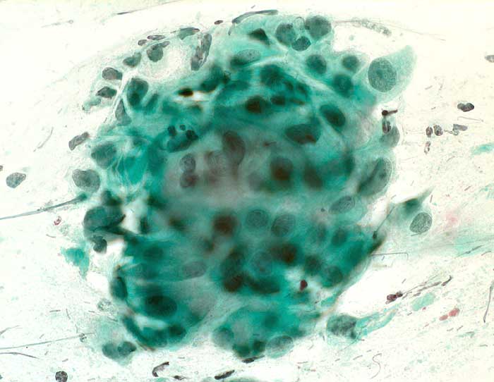 Portioabstrich: mehrere sehr grosse Kerne mit Zylinderzellen und Nacktkernen. Chromatin normal, fein und regelmässig verteilt. Keine vergrösserten Nukleolen.