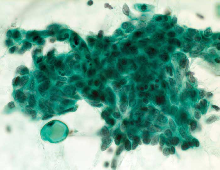 Portioabstrich: Grösserer Verband aus nicht sicher zu klassifizierenden Zellen, die teils an metaplastische Plattenepithelien, teils an Zylinderzellen erinnern. Kerne mittelgross und leicht entrundet. Chromatin fein gekörnt, leicht hyperchromatisch. Erhöhte Kern-Zytoplasma Relation. Keine eindeutigen Zellatypien.