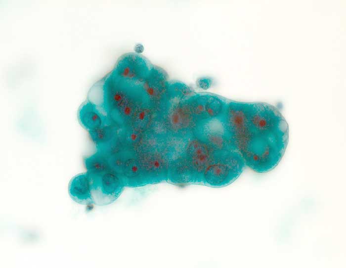 Pleuraerguss: kleiner dreidimensionaler polyzyklischer Tumorzellverband. Tumorzellen mit grossen runden vesikulären Kernen und einem eosinophilen Makronukleolus. Zytoplasma teilweise vakuolisiert.