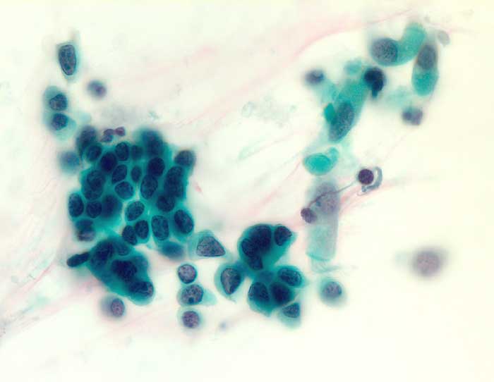 Bronchialsekret: zweidimensionaler Verband kleiner Zellen mit dichten, hyperchromatischen rundlichen Kernen und schmalem Zytoplasmasaum. Die Zellen sind in regelmässigen Abständen voneinander angeordnet.