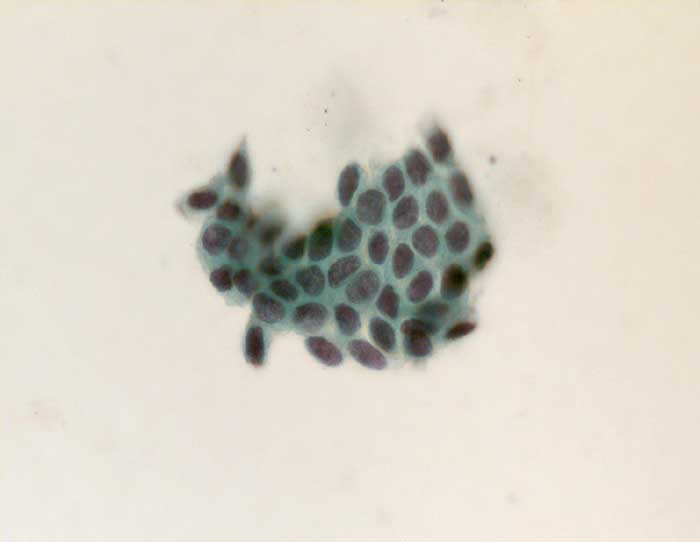 Sekretaspiration aus Cavum uteri: regelmässiger Zylinderzellverband des Corpusendometrium ohne Atypie.