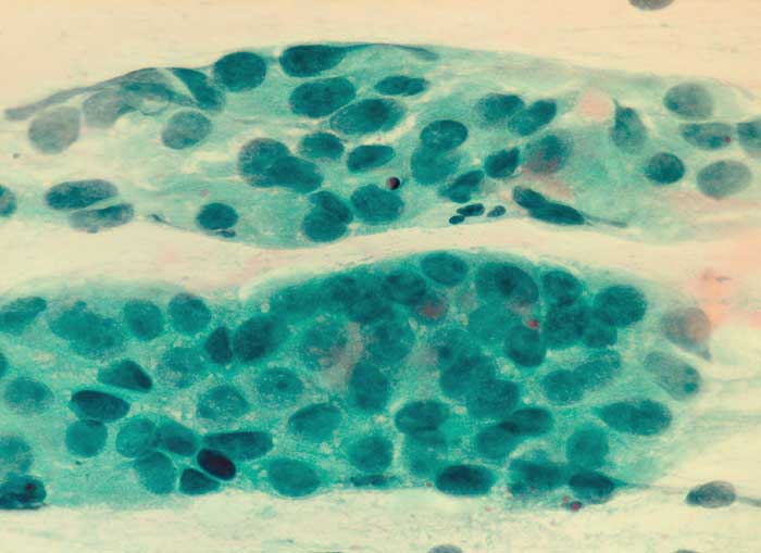 Portioabstrich: Tapetenförmige Verbände atypischer Zellen.