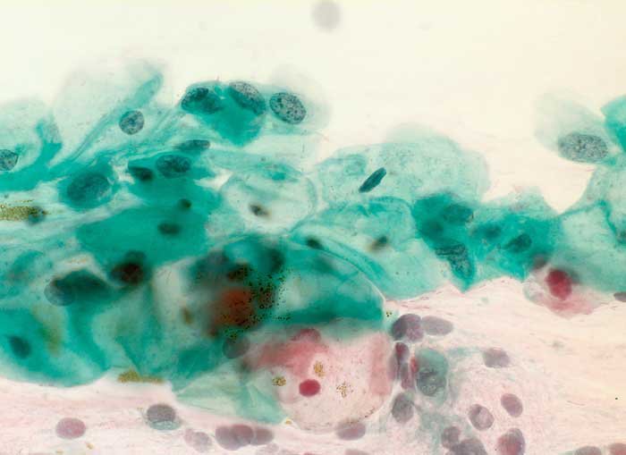 Portio/Zervix Abstrich: Mehrere Zellen vom intermediären Typ. Kerne leicht vergrössert und deformiert. Chromatinkörnung etwas verstärkt. Zytoplasma breit und unauffällig. Der Einschluss von feinen Luftblasen vor dem Eindecken führt zu einer Ansammlung geldgolber Kügelchen.