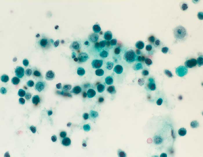 Urin: Meist einzeln liegende, oftmals degenerativ veränderte, hochgradig atypische Zellen mit ganz unterschiedlich grossen, polymorph gelappten und gefurchten vesikulären Kernen, die ein vermehrt grob strukturiertes Chromatin und meist einen prominenten basophilen Nukleolus enthalten. Das Zytoplasma schmal und uncharakteristisch zyanophil. Hohe Kernplasmarelation.