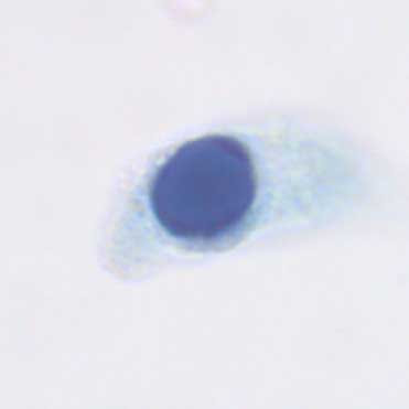 Tubulusepithelzelle mit milchglasartigem Kerneinschluss (Viruspartikel). Das zelleigene Chromatin ist an die Kernmembran gedrückt und erscheint als dunkler Ring in der Kernperipherie.