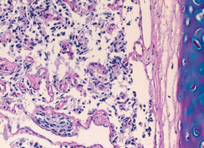 Spindelzellige Tumorzellnester bilden kleine von schmalen Bindegewebssepten mit Kapillaren umgebene Zellnester. Der Tumor infiltriert die Submukosa.