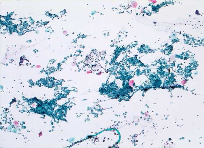Bronchoalveoläre Lavage verunreinigt mit Sekret aus Mundhöhle und Bronchialsystem ( Plattenepithelien). Ausgedehnte konfluierte epitheloidzellige Granulome.