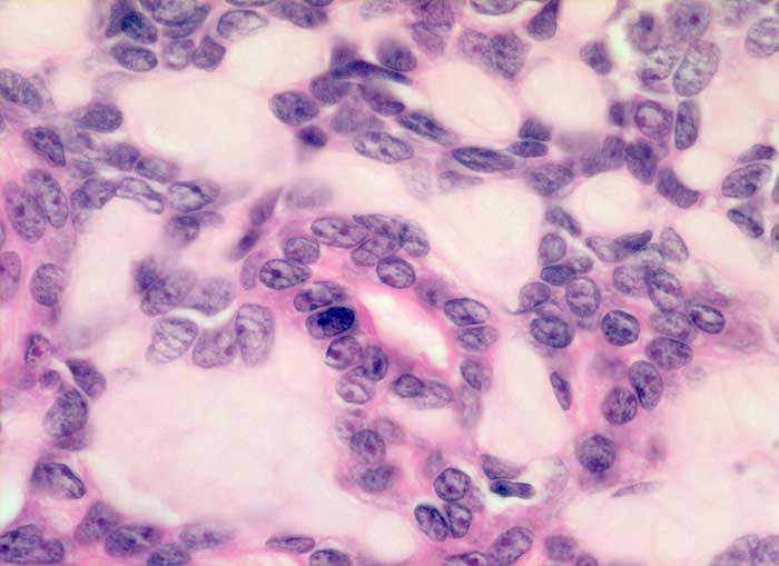 Kribriformer Tumor aus kleinen dichtstehenden zytoplasmaarmen Tumorzellen mit hyperchromatischen eckigen oder rundlichen Kernen mit einem kleinen eosinophilen Nukleolus. Die zystischen Hohlräume enthalten eine eosinophile homogene Masse.