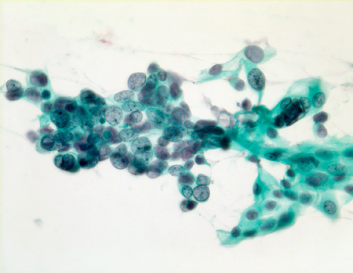 Lockerer Verband grosser, teils mehrkerniger Zellen mit vesikulären Kernen,leicht vergröbertem Chromatin und gut erkennbaren Nukleolen.