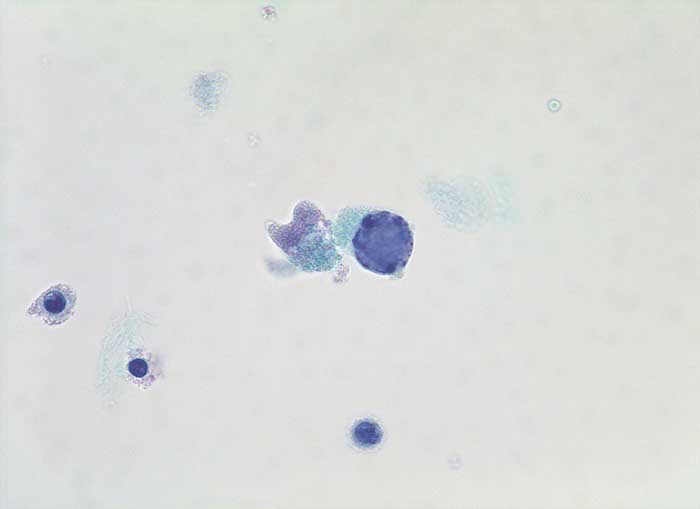 Tubulusepithelzelle mit milchglasartigem Kernplasma (Viruspartikel). Das zelleigene Chromatin ist an die Kernmembran verdrängt und erscheint als dunkler peripherer Ring.