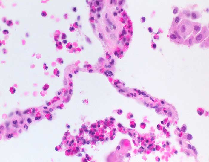 Der morphologische Befund ist klassisch für ein Churg-Strauss-Syndrom und passt auch zu der Anamnese eines mehrjährigen Asthmas mit aktueller Bluteosinophilie und IgE-Erhöhung. Der Befund könnte im Zusammenhang stehen mit einer ca. seit drei Monaten bestehenden Therapie mit Leukotrien-Rezeptorantagonisten, welche nach Berichten aus der Literatur ein Churg-Strauss-Syndrom möglicherweise demarkieren können.