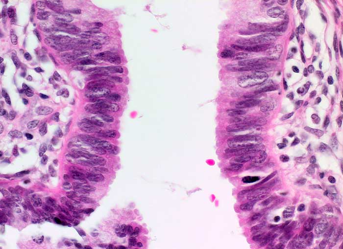 Von atypischem mehrreihigen Epithel ausgekleidete Zervixdrüsen. Die Kerne überlagern sich teilweise, sind vergrössert und hyperchromatisch.