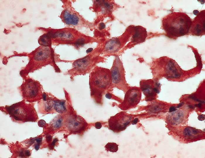 Mediastinum, Feinnadelpunktion: Massenhaft grossleibige Karzinomzellen mit runden Kernen und Makronukleolus. Die Tumorzellen sind stark positiv für Vimentin.