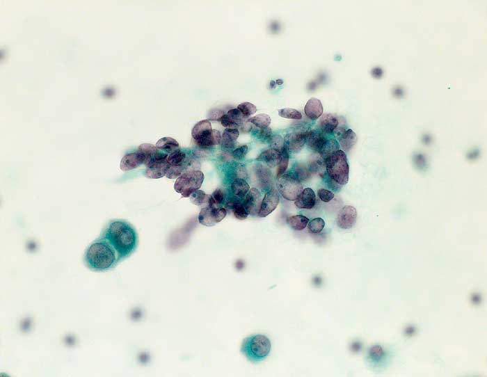 Pleuraerguss: kleines dichtes Aggregat atypischer Zellen mit Kernen, die etwa doppelt so gross sind wie die Kerne von Makrophagen. Das Zytoplasma meist sehr schmal, oft auch nicht sichtbar. Die Kerne sind fragil.