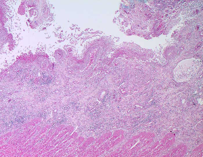 Ulkus mit Kolliquationsnekrose und Fibrinschorf. Die Erreger sind in dieser Vergrösserung nicht zu sehen.