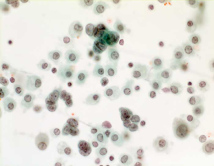 Pleuraerguss: Die Tumorzellen bilden zeilenförmige Verbände. Die Kerne mit Pfeffer und Salz Chromatin und kleine Nukleolen dellen sich gegenseitig ein.
