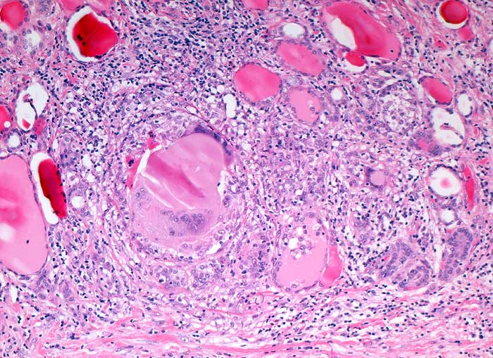 Das Schilddrüsenparenchym wird fokal von einer granulomatös-riesenzelligen Entzündung zerstört. Mehrere Riesenzellen umgeben das Kolloid eines zerstörten Follikels.
