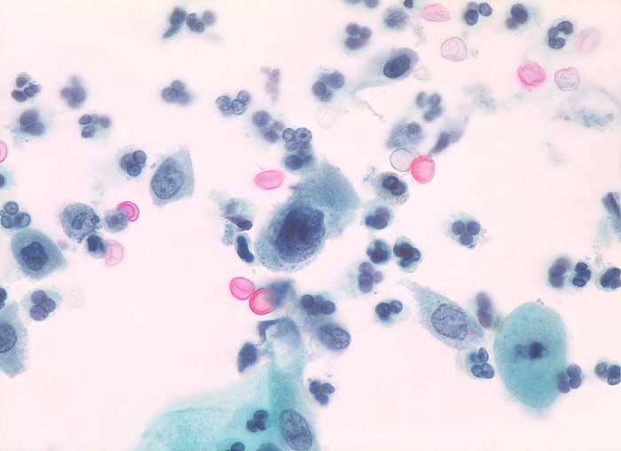 Vor einem granulozytär entzündlichen Hintergrund finden sich deutlich aktivierte Urothelzellen mit vergrösserten Kernen. In der Mitte eine Urothelzelle mit hyperchromatischem Kern.