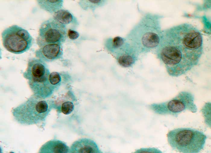 Massenhaft onkozytäre Zellen mit relativ breitem Zytoplasma und unterschiedlich grossen, exzentrisch gelegenen Kernen, die einen besonders auffälligen grossen Nukleolus enthalten. Einige Kerne sind gekerbt.