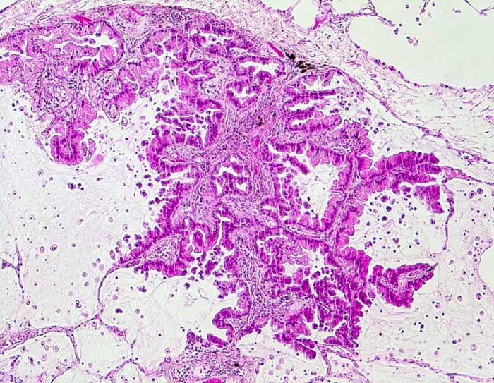 Monomorphe, hochzylindrische schleimbildende Zellen mit basalständigen Kernen und geringen Atypien tapezieren die Alveolarsepten aus. Das Lungengerüst bleibt erhalten. Die Alveolarlichtungen sind schleimgefüllt und enthalten Schaumzellen.