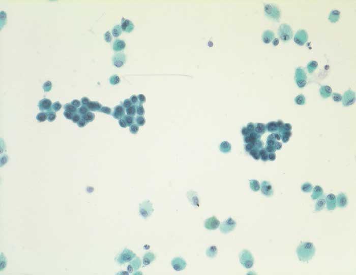 Grössere strangförmige kohäsive Tumorzellverbände auf sauberem Hintergrund. Die Tumorzellkerne sind etwa gleich gross wie die Kerne der benachbarten Alveolarmakrophagen und etwas dunkler als diese. Auf den ersten Blick können die Tumorzellverbände mit Creola Körperchen verwechselt werden. Den Tumorzellen fehlt aber der Flimmerhaarbesatz.