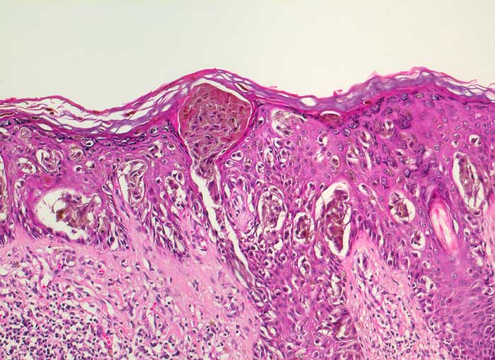 Sehr unterschiedlich grosse und unterschiedlich geformte Nester stark pigmentierter atypischer Melanozyten. Zusätzlich zahlreiche atypische Einzelzellen, die die gesamte Breite der Epidermis durchwandern. Die angrenzende papilläre Dermis ist lymphozytär infiltriert ohne Nachweis von Tumorzellen.