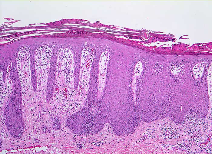 Gleichmässig verlängerte und basal verbreiterte Reteleisten=regelmässige Akanthose. Fokale Spongiose (interzelluläres Ödem). Neutrophilenreiche Parakeratosekappe. Fehlendes Stratum granulosum. Entzündlich infiltriertes ödematöses Stratum papillare mit ektatischen Gefässen und lymphozytärem Entzündungsinfiltrat. Insgesamt liegt das Bild einer spongiotisch-psoriasiformen Dermatitis vor.