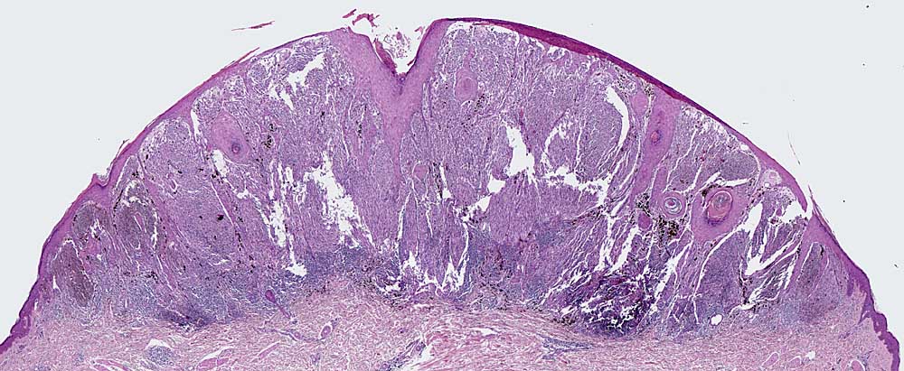 Auffallend symmetrischer Tumor aus spindeligen Tumorzellen. Auf den ersten Blick erinnert die Läsion an einen Spitz Naevus. Die Pigmentverteilung ist jedoch asymmetrisch, die Tumorzellen bilden sehr zellreiche expansive Faszikel ohne dazwischenliegendes Stroma, die Epidermis ist fokal verdünnt.