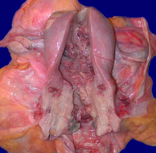 Längsschnitt durch den Uterus. Die Zervix ist aufgetrieben durch einen gelblich-weissen Tumor. Exophytischer Tumor im Bereich des Uteruscavum mit Infiltration bis unter die Serosa. Angeschnittenes tumorfreies Ovar.
