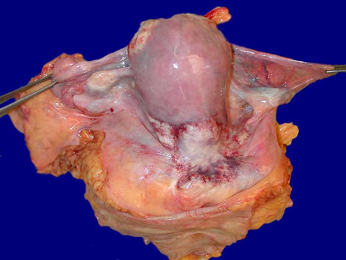 Blick auf den Uterus von dorsal. Das Peritoneum wird im Bereich der Zervix und des Uterusfundus durch stark vaskularisierte Tumoren infiltriert. Tumorfreies Ovar. Tumor im Bereich des Uteruscavum mit Infiltration bis unter die Serosa.
