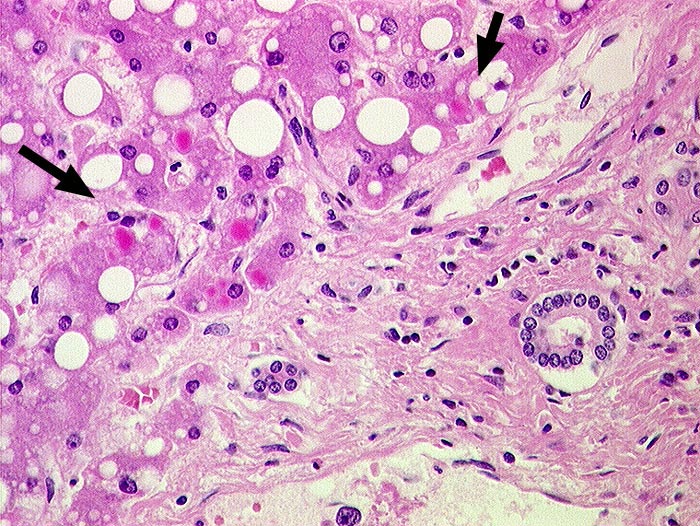 Eosinophile Zytoplasmaeinschlüsse in periportalen Hepatozyten. Grobtropfige Verfettung.