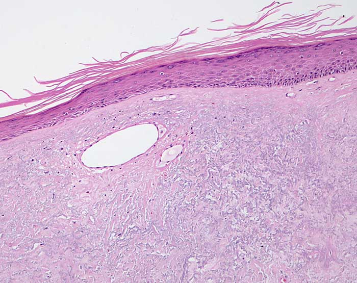 Hyperkeratose. Vollständige Atrophie der Adnexe. Dermale Sklerose und ausgeprägte Elastose. Teleangiektasien.