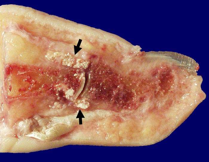 Weisse Gichtkristallablagerungen in Weichteilen und Knochen des proximalen Interphalangealgelenks der Grosszehe.