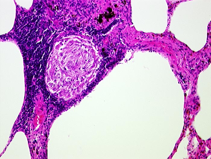 Granulom aus Epitheloidzellen umgeben von Lymphozyten in einem Alveolarseptum.