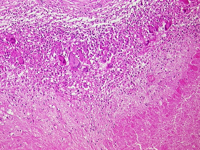 Mesenteriale Lymphknoten mit verkäsenden Granulomen aus Epitheloidzellen und Riesenzellen.