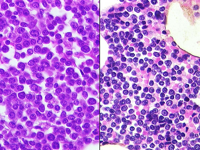 Links AML: schmaler Zytoplasmasaum. Kerne etwas grösser als bei der ALL rechts im Bild.