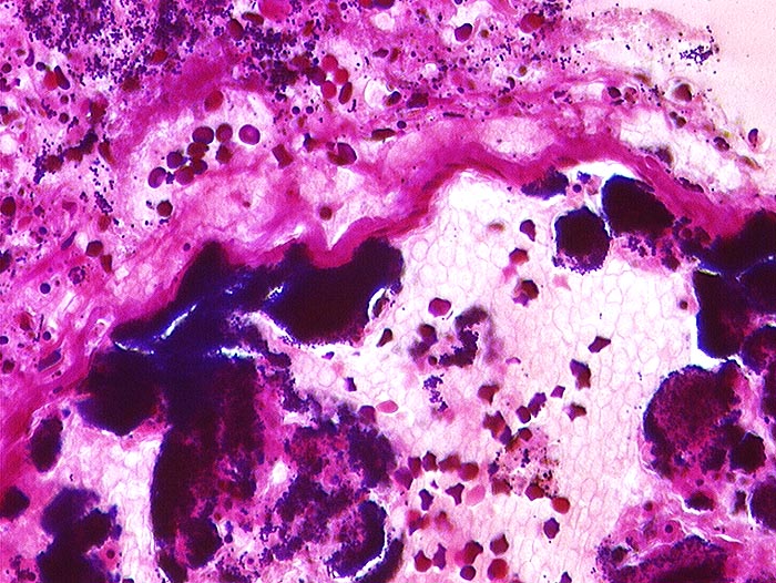 Staphylokokkus aureus: Gram positive Bakterienhaufen in einem Pulmonalarterienast. Die Kokkenbakterien bilden kleine Haufen.